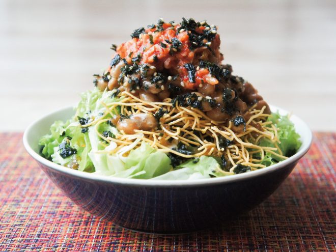 わかめキムチ納豆パリパリ麵サラダ 材料納豆(丹念納豆)、レタス、キャベツ、パリパリ麵、キムチ、ザクザクわかめふりかけわかめキムチ納豆パリパリ麵サラダの作り方①レタスとキャベツは、食べやすい大きさに切ったら、器に盛りつけます。②パリパリ麵、よく混ぜた納豆をかけたら、キムチをのせます。③ザクザクわかめをかけたら完成です。