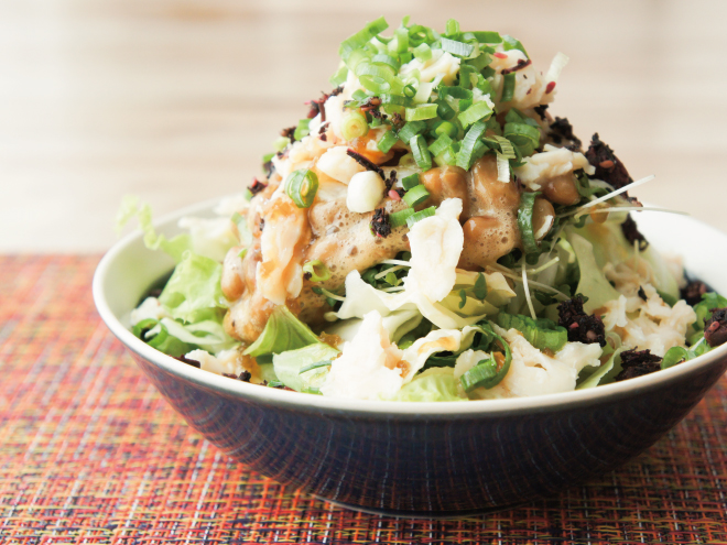 カリカリ梅ねぎ納豆むし鶏サラダ 材料納豆(丹念納豆)、レタス、キャベツ、ブロッコリースプラウト、蒸し鶏、ねぎ、カリカリ梅しそふりかけ、オニオンドレッシングカリカリ梅ねぎ納豆むし鶏サラダの作り方①レタス、キャベツ、ブロッコリースプラウトは、食べやすい大きさに切ったら、器に盛りつけます。②よく混ぜた納豆をかけたら、蒸し鶏をのせます。③ねぎ、カリカリ梅しそふりかけ、オニオンドレッシングをかけたら完成です。