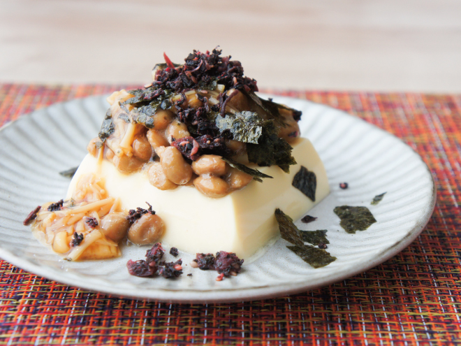 カリカリ梅納豆なめ茸海苔たまご豆腐 材料納豆(丹念納豆)、たまご豆腐、なめ茸、カリカリ梅しそふりかけ、味付け海苔カリカリ梅納豆なめ茸海苔たまご豆腐の作り方①たまご豆腐を盛り付けたら、よく混ぜた納豆をかけます。②なめ茸、カリカリ梅しそふりかけをかけて、味付け海苔を散らしたら完成です。