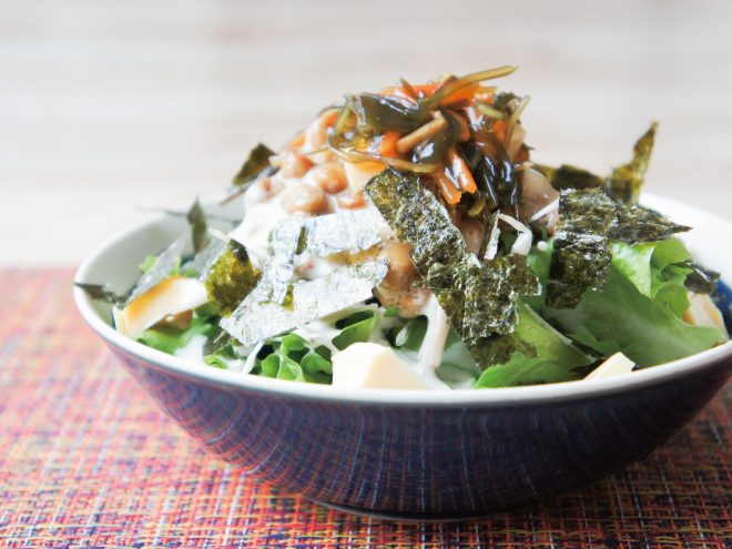 納豆(丹念納豆)、レタス、キャベツ、ブロッコリースプラウト、松前漬け、スモークチーズ、味付け海苔、シーザードレッシング