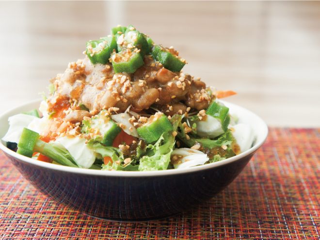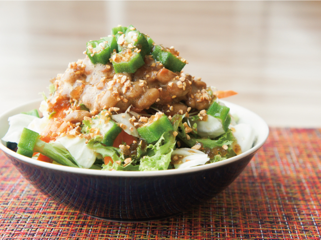 カリカリきなこオクラ胡麻納豆ブロッコリースプラウトサラダ 材料納豆(丹念納豆)、レタス、キャベツ、にんじん、ブロッコリースプラウト、オクラ、ごま、カリカリきなこ、オニオンドレッシングカリカリきなこオクラ胡麻納豆ブロッコリースプラウトサラダの作り方①レタス、キャベツ、にんじん、ブロッコリースプラウトは、食べやすい大きさに切ったら、器に盛りつけます。②よく混ぜた納豆をかけたら、切ったオクラをのせます。③ごま、カリカリきなこ、オニオンドレッシングをかけたら完成です。