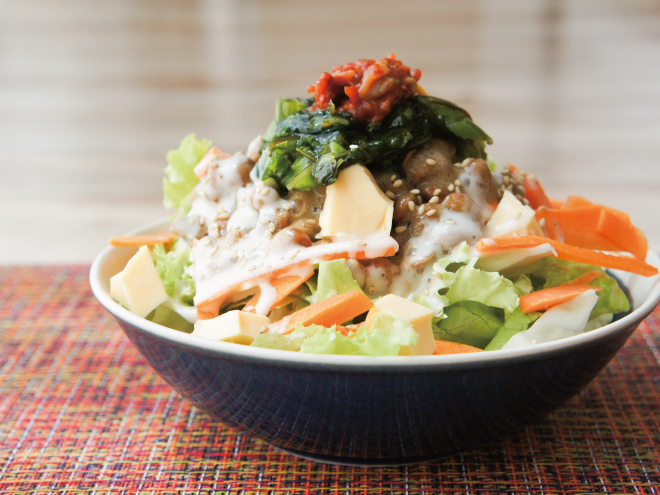 納豆(丹念納豆)、レタス、キャベツ、にんじん、スモークチーズ、わさび野沢菜昆布、タラチャンジャ、ごま、シーザードレッシング