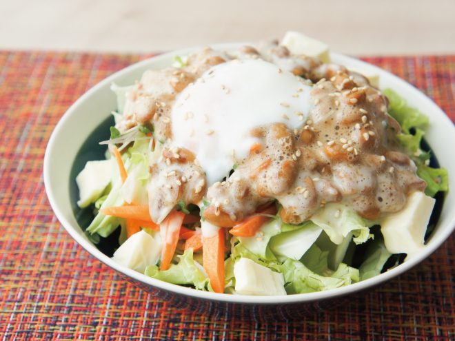 柚子こしょう温玉ごま納豆カマンベールチーズサラダ 材料納豆(丹念納豆)、レタス、キャベツ、ニンジン、ブロッコリースプラウト、温泉卵、ごま、カマンベールチーズ、柚子こしょうドレッシング柚子こしょう温玉ごま納豆カマンベールチーズサラダの作り方①レタス、キャベツ、ニンジン、ブロッコリースプラウトは、食べやすい大きさに切ったら、器に盛りつけます。②よく混ぜた納豆をかけたら、カマンベールチーズをのせます。③温泉卵を落としたら、ごま、柚子こしょうドレッシングをかけて完成です。