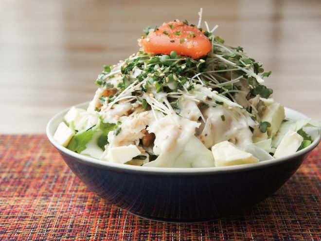 青のり明太子納豆蒸し鶏カマンベールチーズシーザーサラダ 材料納豆(丹念納豆)、レタス、キャベツ、ブロッコリースプラウト、カマンベールチーズ、蒸し鶏、ごま、青のり、明太子、シーザードレッシング青のり明太子納豆蒸し鶏カマンベールチーズシーザーサラダの作り方①レタスとキャベツは、食べやすい大きさに切ったら、器に盛りつけます。②よく混ぜた納豆をかけたら、蒸し鶏を盛り付けます。③カマンベールチーズ、ブロッコリースプラウトをのせて、シーザードレッシングをかけます。④明太子をのせたら、ごま、青のりを散らして完成です。