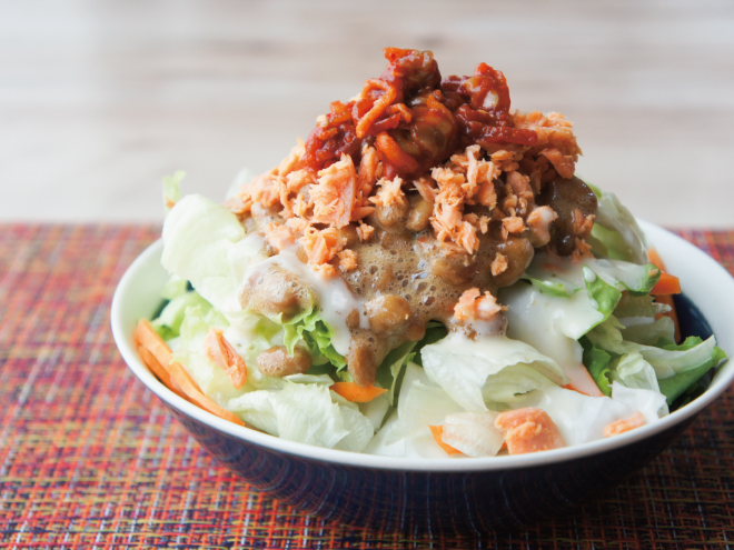 タラチャンジャ鮭納豆シーザーサラダ 材料納豆(丹念納豆)、レタス、キャベツ、にんじん、シャケフレーク、タラチャンジャ、シーザードレッシングタラチャンジャ鮭納豆シーザーサラダの作り方①レタス、キャベツ、にんじんは、食べやすい大きさに切ったら、器に盛りつけます。②よく混ぜた納豆をかけたら、シャケフレークをかけます。③タラチャンジャをのせて、シーザードレッシングをかけたら完成です。