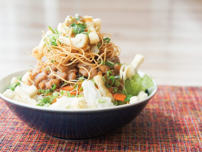 ねぎ納豆パリパリ麺きざみ揚げサラダ