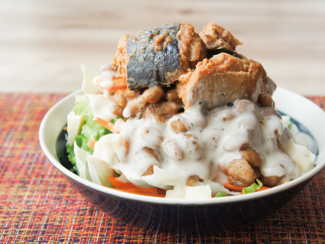 鯖みそ納豆モッツァレラチーズシーザーサラダ 材料納豆(丹念納豆)、レタス、キャベツ、にんじん、鯖みその缶詰、モッツァレラチーズ、シーザードレッシング鯖みそ納豆モッツァレラチーズシーザーサラダの作り方①レタス、キャベツ、にんじんは、食べやすい大きさに切ったら、器に盛りつけます。②よく混ぜた納豆をかけたら、モッツァレラチーズを盛り付けます。③鯖みそをのせて、シーザードレッシングをかけたら完成です。
