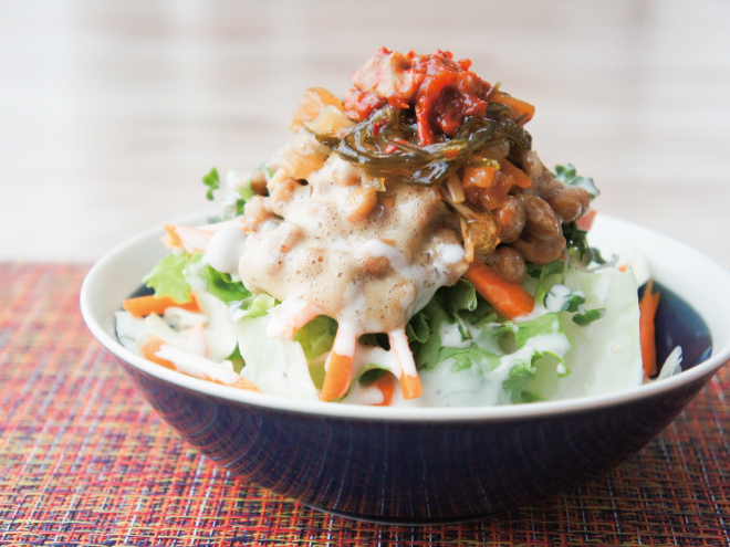 タラチャンジャ納豆数の子松前漬けシーザーサラダ 材料納豆(丹念納豆)、レタス、キャベツ、にんじん、ブロッコリースプラウト、数の子松前漬け、タラチャンジャ、シーザードレッシングタラチャンジャ納豆数の子松前漬けシーザーサラダの作り方①レタス、キャベツ、にんじん、ブロッコリースプラウトは、食べやすい大きさに切ったら、器に盛りつけます。②よく混ぜた納豆をかけたら、数の子松前漬け、タラチャンジャをのせます。③シーザードレッシングをかけたら完成です。