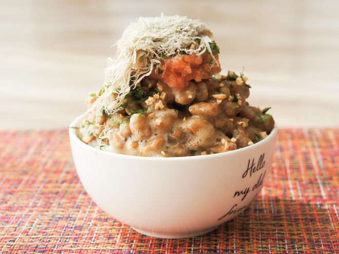 あおさきな粉めんたいこ納豆とろろ昆布もち麦ご飯 材料納豆(丹念納豆)、明太子、カリカリきなこ、あおさ、とろろ昆布、もち麦ご飯あおさきな粉めんたいこ納豆とろろ昆布もち麦ご飯の作り方①お茶碗に、もち麦ご飯をついだら、よく混ぜた納豆をかけます。②明太子をのせて、カリカリきなこ、あおさ、とろろ昆布をかけたら完成です。