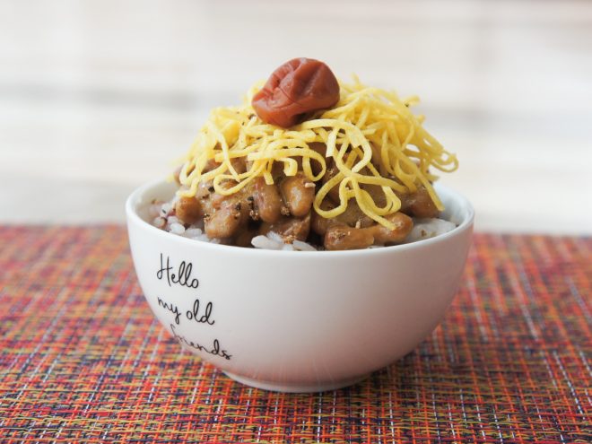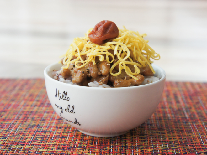 錦糸卵うめ納豆スパイス雑穀ご飯 材料納豆(丹念納豆)、錦糸卵、梅、スパイス、雑穀ご飯錦糸卵うめ納豆スパイス雑穀ご飯の作り方①お茶碗に雑穀ご飯をついだら、よく混ぜた納豆をかけます。②錦糸卵をかけて梅をのせます。③スパイスをかけたら完成です。