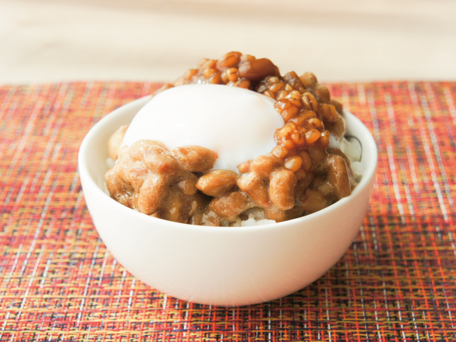 納豆(丹念納豆)、温泉卵、もろみ、麦ご飯
