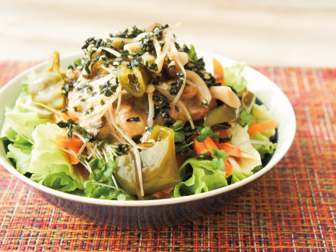 ⑤よく混ぜた納豆をかけたら、③のきのことピーマンのお浸しをのせて、和風醬油ごまドレッシング、ザクザクわかめをかけたら完成です。