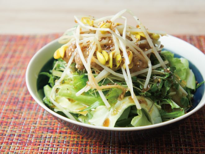 納豆(丹念納豆)、レタス、キャベツ、水菜、ブロッコリースプラウト、大豆もやし、ごま、スパイス、オニオンドレッシング