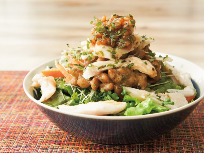 あおさもろみ納豆蒸し鶏サラダ 材料納豆(丹念納豆)、レタス、キャベツ、にんじん、ブロッコリースプラウト、蒸し鶏、もろみ、あおさ、和風醬油ごまドレッシングあおさもろみ納豆蒸し鶏サラダの作り方①レタス、キャベツ、にんじん、ブロッコリースプラウトは、食べやすい大きさに切ったら、器に盛りつけます。②よく混ぜた納豆をかけたら、蒸し鶏をのせます。③もろみ、あおさ、和風醬油ごまドレッシングをかけたら完成です。