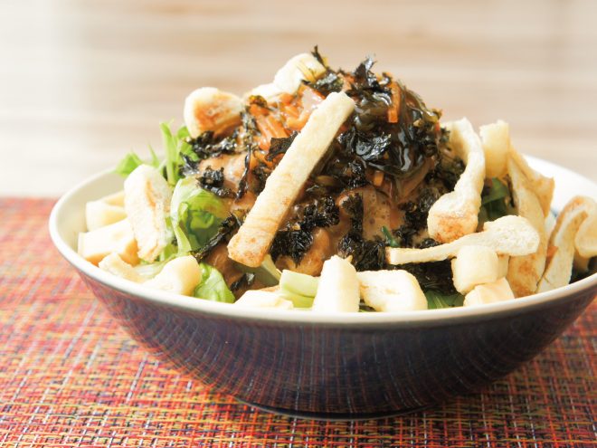 松前漬け韓国のり納豆きざみ揚げサラダ 材料納豆(丹念納豆)、レタス、キャベツ、にんじん、ブロッコリースプラウト、松前漬け、韓国のり、きざみ揚げ、ポン酢松前漬け韓国のり納豆きざみ揚げサラダの作り方①レタス、キャベツ、にんじん、ブロッコリースプラウトは、食べやすい大きさに切ったら、器に盛りつけます。②よく混ぜた納豆をかけたら、松前漬けをのせます。③韓国のり、きざみ揚げ、ポン酢をかけたら完成です。