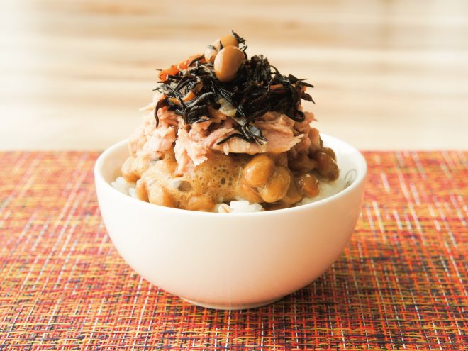 納豆(丹念納豆)、ひじき、シーチキン、麦ご飯