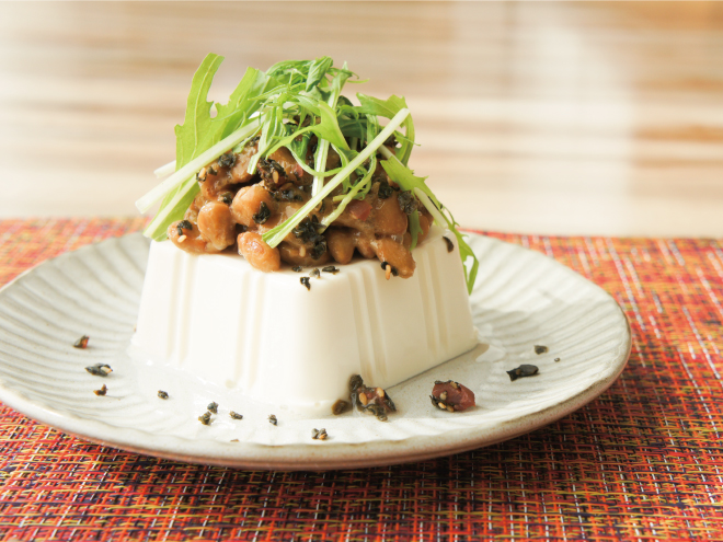 梅しそ水菜納豆冷奴 材料納豆(丹念納豆)、絹ごし豆腐、梅しそわかめふりかけ、水菜梅しそ水菜納豆冷奴の作り方①絹ごし豆腐を盛り付けたら、よく混ぜた納豆をかけます。②梅しそわかめふりかけをかけたら、食べやすい大きさに切った水菜をのせて完成です。