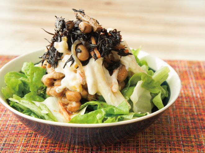 マカロニひじきオリーブポン酢納豆ブロッコリースプラウトサラダ 材料納豆(丹念納豆)、レタス、キャベツ、ブロッコリースプラウト、にんじん、マカロニサラダ、ひじき、オリーブオイル、ポン酢マカロニひじきオリーブポン酢納豆ブロッコリースプラウトサラダの作り方①レタス、キャベツ、ブロッコリースプラウト、にんじんは、食べやすい大きさに切ったら、器に盛りつけます。②よく混ぜた納豆をかけたら、マカロニサラダをのせます。③ひじき、オリーブオイル、ポン酢をかけたら、完成です。