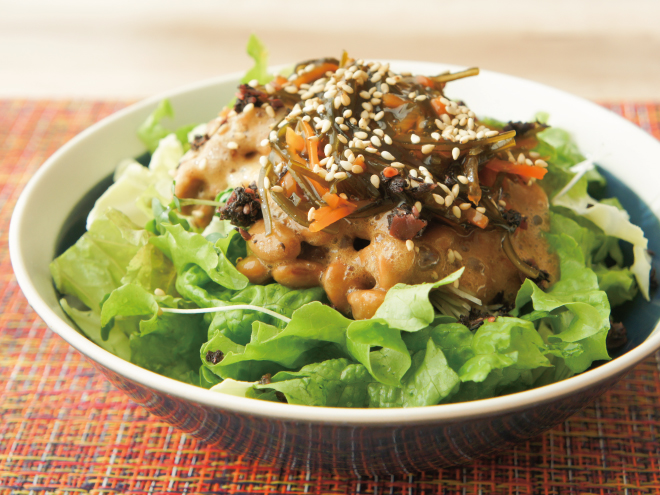 梅しそ松前漬けゴマ納豆ブロッコリースプラウトサラダ 材料納豆(丹念納豆)、レタス、キャベツ、ブロッコリースプラウト、松前漬け、ごま、カリカリ梅しそふりかけ梅しそ松前漬けゴマ納豆ブロッコリースプラウトサラダの作り方①レタス、キャベツ、ブロッコリースプラウトは、食べやすい大きさに切ったら、器に盛りつけます。②よく混ぜた納豆をかけたら、松前漬けをのせます。③ごま、カリカリ梅しそふりかけをかけたら、完成です。