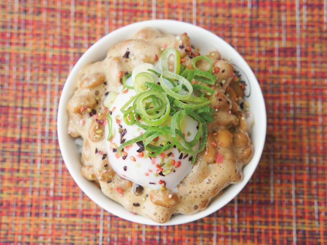 納豆(丹念納豆)、温泉卵、ネギ、わさび梅ふりかけ、麦ご飯