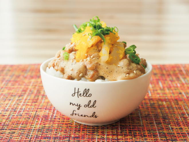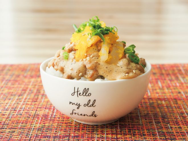 ①お茶碗に麦ご飯をついだら、よく混ぜた納豆をかけます。
