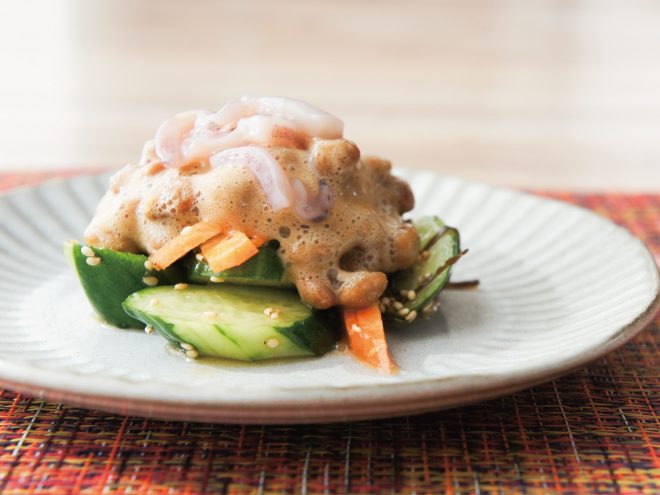 ③お皿に、②のきゅうり漬けを盛りつけたら、よく混ぜた納豆をかけます。