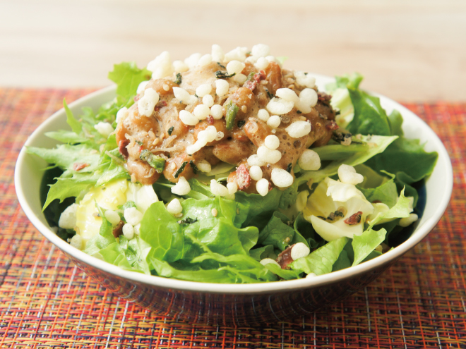 カリカリ梅ちりめん天かす納豆オリーブサラダ 材料納豆(丹念納豆)、レタス、キャベツ、カリカリ梅ちりめんふりかけ、天かす、オリーブオイルカリカリ梅ちりめん天かす納豆オリーブサラダの作り方①レタスとキャベツは、食べやすい大きさに切ったら、器に盛りつけます。②よく混ぜた納豆と、オリーブオイルをかけます。③カリカリ梅ちりめんふりかけ、天かすをかけたら完成です。