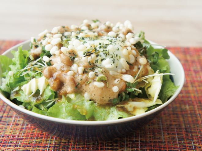 天かす温玉わさび納豆ブロッコリースプラウトサラダ 材料納豆(丹念納豆)、レタス、キャベツ、ブロッコリースプラウト、天かす、温泉卵、わさびふりかけ、玉ねぎドレッシング天かす温玉わさび納豆ブロッコリースプラウトサラダの作り方①レタス、キャベツ、ブロッコリースプラウトは、食べやすい大きさに切ったら、器に盛りつけます。②よく混ぜた納豆をかけたら、温泉卵をのせます。③玉ねぎドレッシング、天かす、わさびふりかけをかけたら完成です。