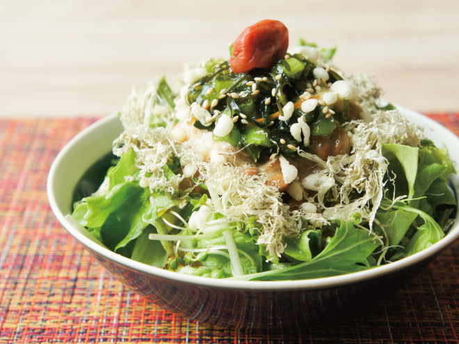 ③天かす、ごま、とろろ昆布、和風醬油ごまドレッシングをかけたら、梅をのせて完成です。