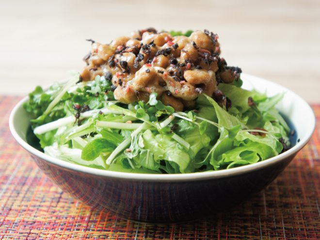カリカリ梅しそオリーブ納豆水菜サラダ 材料納豆(丹念納豆)、レタス、キャベツ、水菜、ブロッコリースプラウト、カリカリ梅しそふりかけ、オリーブオイルカリカリ梅しそオリーブ納豆水菜サラダの作り方①レタス、キャベツ、水菜、ブロッコリースプラウトは、食べやすい大きさに切ったら、器に盛りつけます。②よく混ぜた納豆をかけたら、オリーブオイル、カリカリ梅しそふりかけをかけて完成です。
