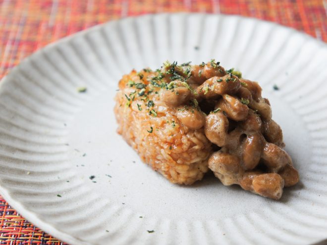 ①焼きおにぎりを盛り付けたら、よく混ぜた納豆をかけます。