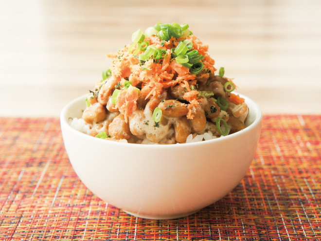 納豆(丹念納豆)、ネギ、鮭フレーク、わさびふりかけ、麦ご飯