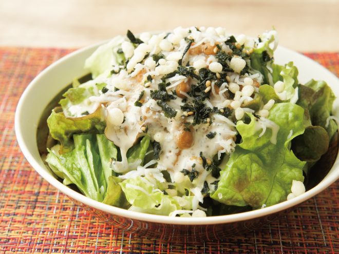 納豆(丹念納豆)、レタス、キャベツ、ザクザクわかめ、天かす、ちりめん、シーザードレッシング