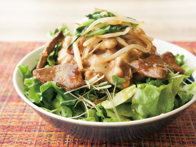 納豆(丹念納豆)、レタス、キャベツ、ブロッコリースプラウト、レバニラ炒め、和風醬油ごまドレッシング