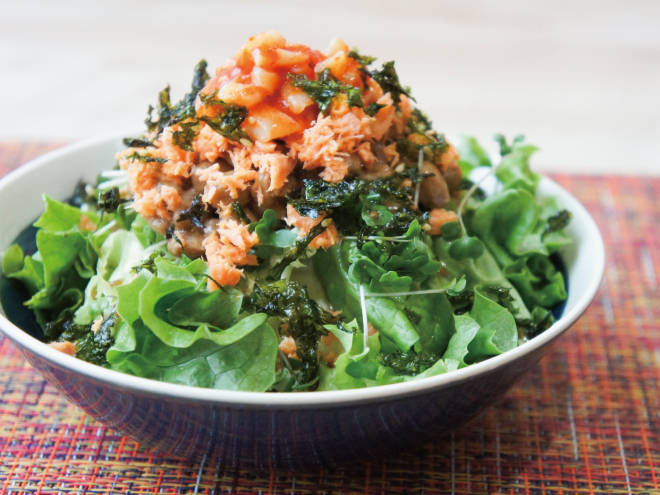 つぶ貝チャンジャ鮭のり納豆サラダ 材料納豆(丹念納豆)、レタス、キャベツ、ブロッコリースプラウト、シャケフレーク、つぶ貝チャンジャ、韓国のり、和風醬油ごまドレッシングつぶ貝チャンジャ鮭のり納豆サラダの作り方①レタス、キャベツ、ブロッコリースプラウトは、食べやすい大きさに切ったら、器に盛りつけます。②よく混ぜた納豆をかけたら、和風醬油ごまドレッシング、シャケフレークをかけます。③つぶ貝チャンジャをのせて、韓国のりをかけたら完成です。