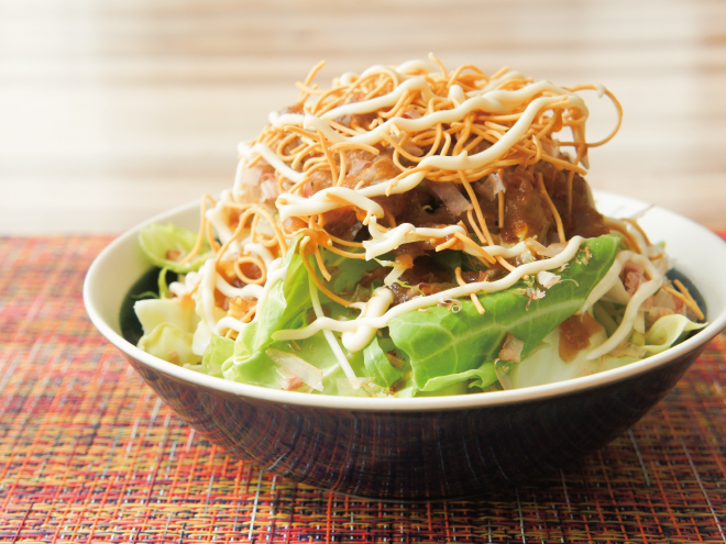 ③大根おろしドレッシングをかけ、パリパリ麺をのせて、燻製マヨネーズをかけたら完成です。