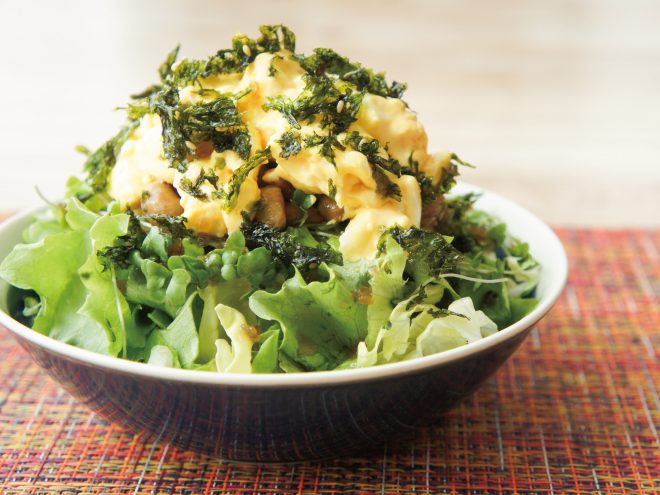韓国のり納豆オニオンたまごサラダ 材料納豆(丹念納豆)、レタス、キャベツ、ブロッコリースプラウト、たまごサラダ、韓国のり、玉ねぎドレッシング韓国のり納豆オニオンたまごサラダの作り方①レタス、キャベツ、ブロッコリースプラウトは、食べやすい大きさに切ったら、器に盛りつけます。②よく混ぜた納豆をかけたら、たまごサラダをのせます。③韓国のりを散らして、玉ねぎドレッシングをかけたら完成です。