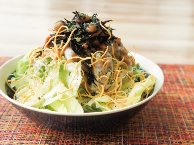 納豆(丹念納豆)、レタス、キャベツ、ブロッコリースプラウト、ひじき煮、パリパリ麺、わさびふりかけ、シーザードレッシング