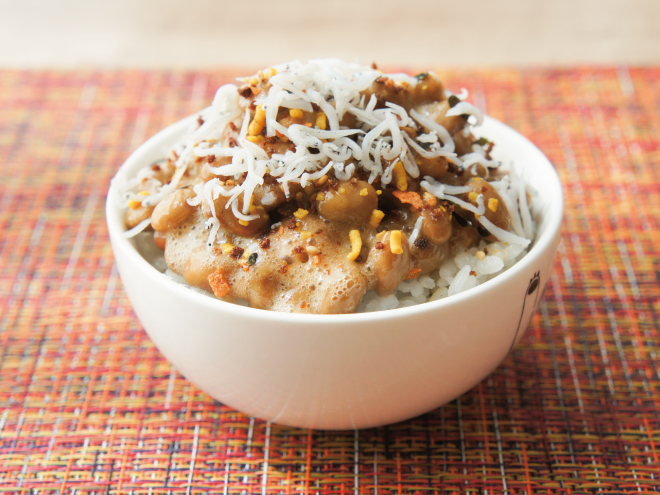 黒牛ちりめん納豆麦ご飯 材料納豆(丹念納豆)、黒牛ふりかけ、ちりめんじゃこ、麦ご飯黒牛ちりめん納豆麦ご飯の作り方①お茶碗に麦ご飯をついだら、よく混ぜた納豆をかけます。②黒牛ふりかけ、ちりめんじゃこをかけたら完成です。