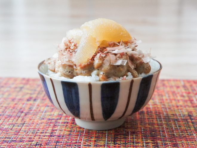 納豆(丹念納豆)、かつおぶし、醤油、数の子、麦ご飯