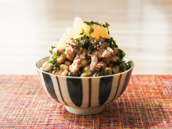 ①お茶碗に麦ご飯をついだら、よく混ぜた納豆をかけます。