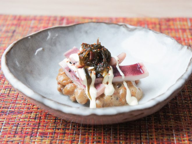 七味マヨイカもずく納豆 材料納豆(丹念納豆)、イカ焼き、もずく、七味、マヨネーズ七味マヨイカもずく納豆の作り方①よく混ぜた納豆を盛り付けたら、焼きイカをのせます。②もずく、七味、マヨネーズをかけたら完成です。
