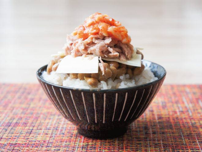 つぶ貝チャンジャシーチキンチーズ納豆麦ご飯 材料納豆(丹念納豆)、つぶ貝チャンジャ、シーチキン、チーズ、麦ご飯つぶ貝チャンジャシーチキンチーズ納豆麦ご飯の作り方①お茶碗に麦ご飯をついだら、よく混ぜた納豆をかけます。②チーズをのせたら、シーチキン、つぶ貝チャンジャをかけて完成です。