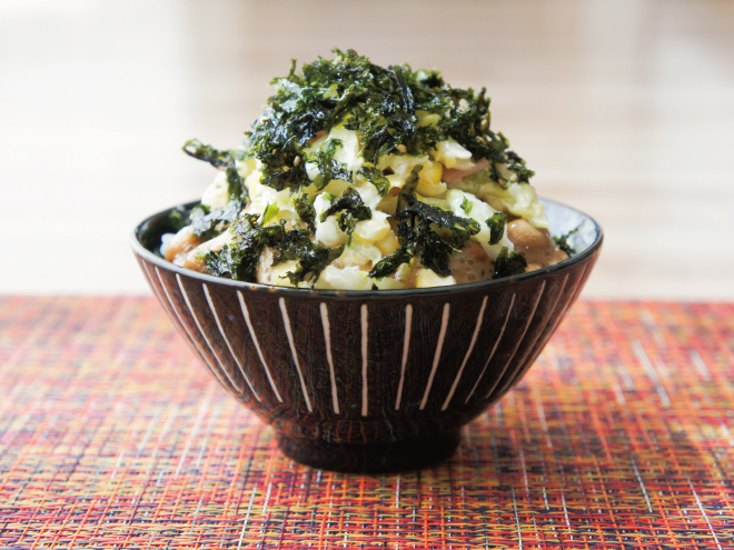 ①お茶碗に麦ご飯をついだら、よく混ぜた納豆をかけます。
