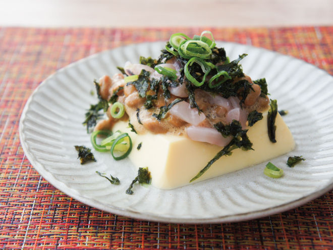 柚子イカの塩辛ネギのり納豆たまご豆腐 材料納豆(丹念納豆)、柚子イカの塩辛、ネギ、韓国のり、たまご豆腐柚子イカの塩辛ネギのり納豆たまご豆腐の作り方①たまご豆腐を盛り付けたら、よく混ぜた納豆をかけます。②柚子イカの塩辛をのせて、ネギ、韓国のりをかけたら完成です。