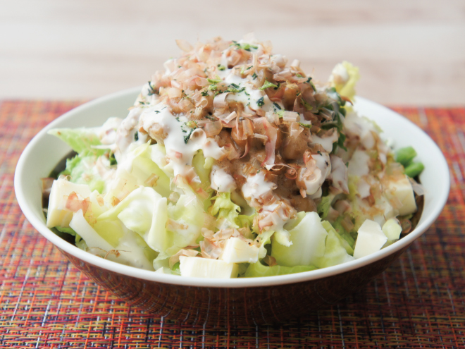 ③かつおぶし、シーザードレッシングをかけて、わさびふりかけをかけたら完成です。