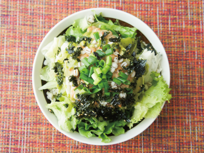 ③ルッコラドレッシングをかけて、韓国のり、刻みネギをかけたら完成です。