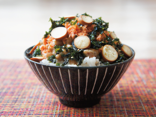 スモークチーズのり鮭納豆麦ご飯の作り方