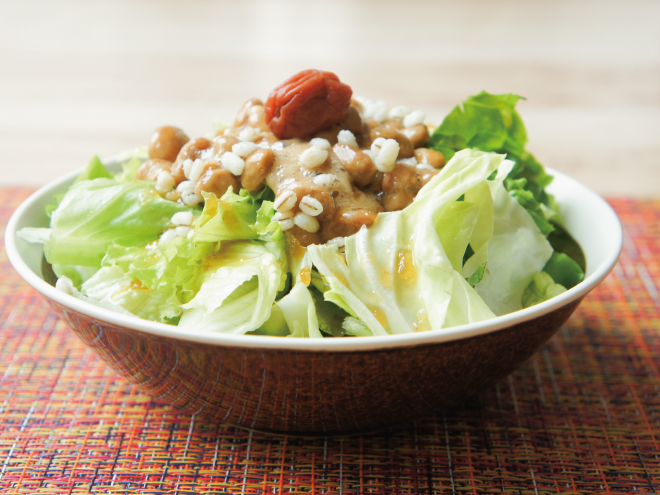 梅おろし納豆もち麦サラダ 材料納豆(丹念納豆)、レタス、キャベツ、もち麦、梅、大根おろしドレッシング梅おろし納豆もち麦サラダの作り方①レタスとキャベツは、食べやすい大きさに切ったら、器に盛りつけます。②よく混ぜた納豆をかけたら、柔らかくしたもち麦をかけます。③梅をのせて、大根おろしドレッシングをかけたら完成です。