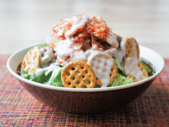 キムチ納豆プレッツェルシーザーサラダ 材料納豆(丹念納豆)、レタス、キャベツ、ブロッコリースプラウト、キムチ、プレッツェル、シーザードレッシングキムチ納豆プレッツェルシーザーサラダの作り方①レタス、キャベツ、ブロッコリースプラウトは、食べやすい大きさに切ったら、器に盛りつけます。②よく混ぜた納豆をかけたら、キムチをのせます。③プレッツェルを盛り付けて、シーザードレッシングをかけたら完成です。